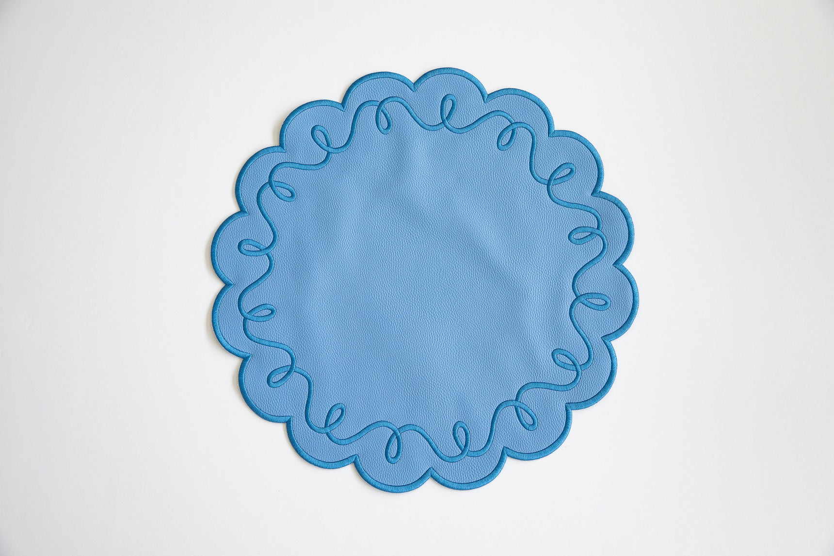 The Waves set features a linen duck candy stripe fabric fabric with and contrasting colored double ebroidery in a modern wave cut out border. and coordinating square napkin 40 x 40 cm